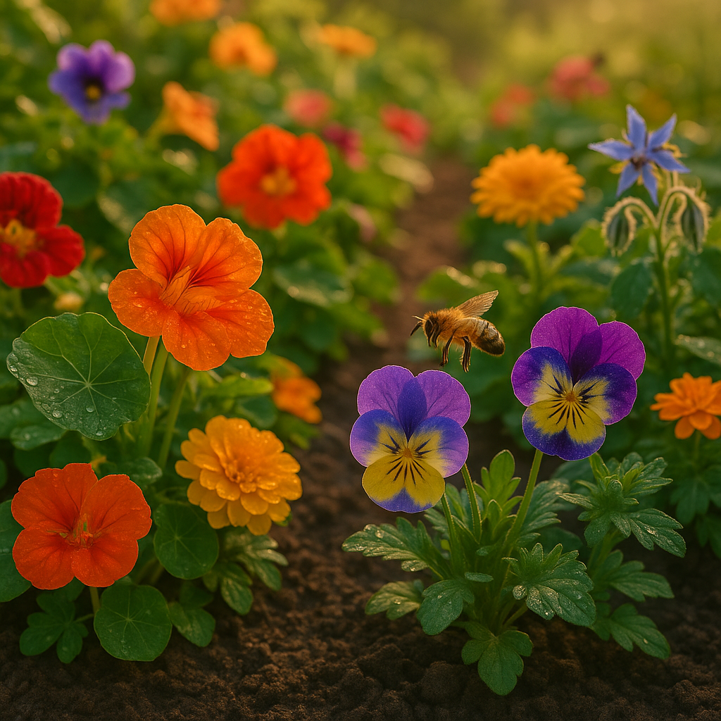 Plante flores comestíveis entre seus vegetais e ervas para controle natural de pragas, polinização e biodiversidade.
